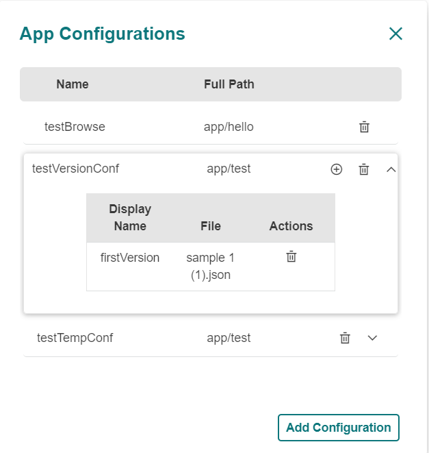 To add a required file to a specific version, click the 'add' icon in the List Configurations screen.
