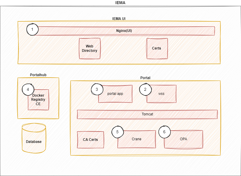 | ④ | IEMA | Services of the Core Domain: Portal Service: Manages Applications and Devices. ws: Endpoint for Device Communication. Registry (6): Docker Registry hosting images. |