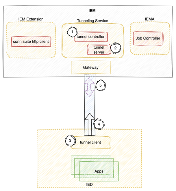 | ③ | IED's job engine & IEMA's job engine communication follows the default mechanism within the system, using a JWT token signed with generated private key on the device, verified with the public key located in IEM. |