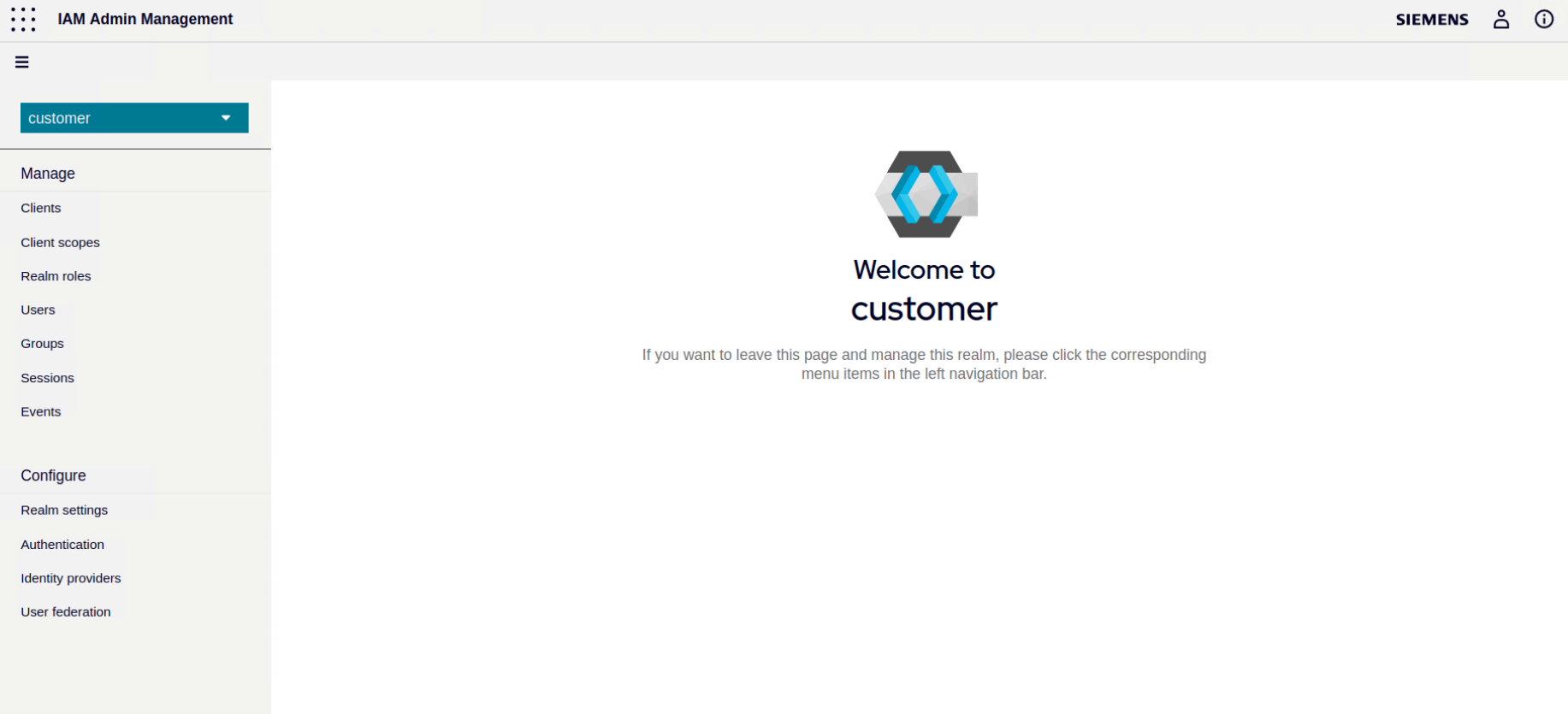 If the user is logged in as customer_admin, he will be able to access customer realm admin console by clicking on Identity and Access Management icon on launchpad. The user will see various options to manage clients, realm roles, users, groups, sessions, events etc. The user can also configure authentication and identiy providers or change realm settings here.
